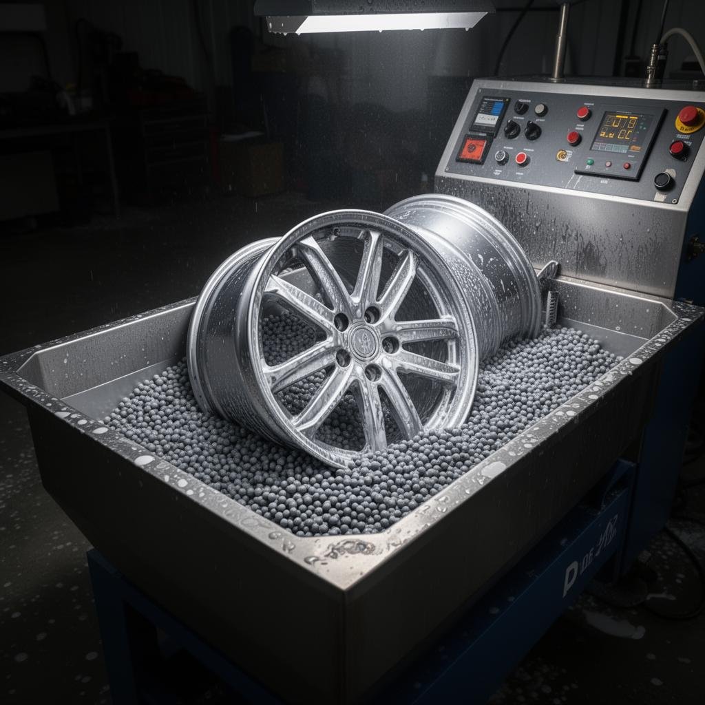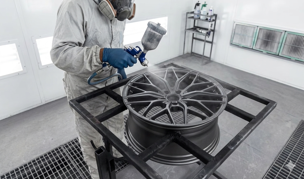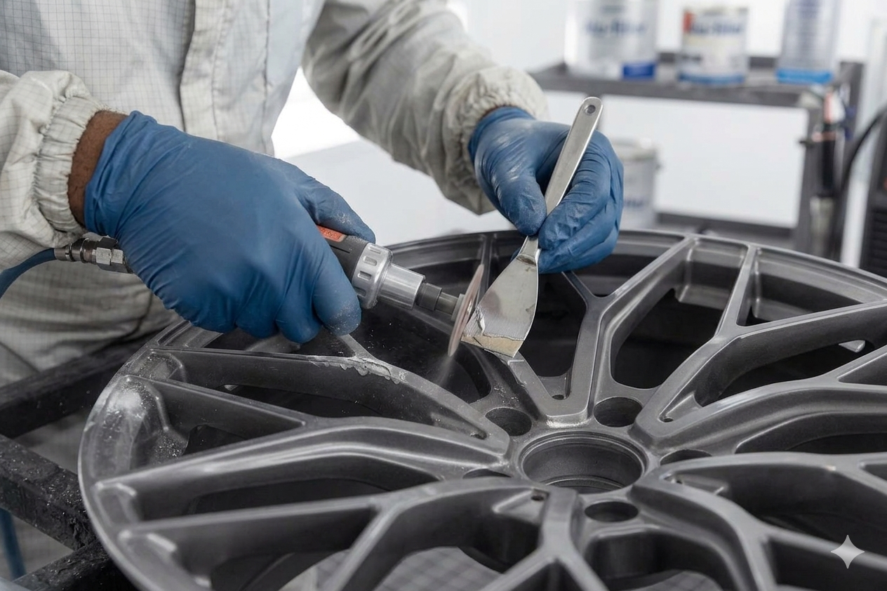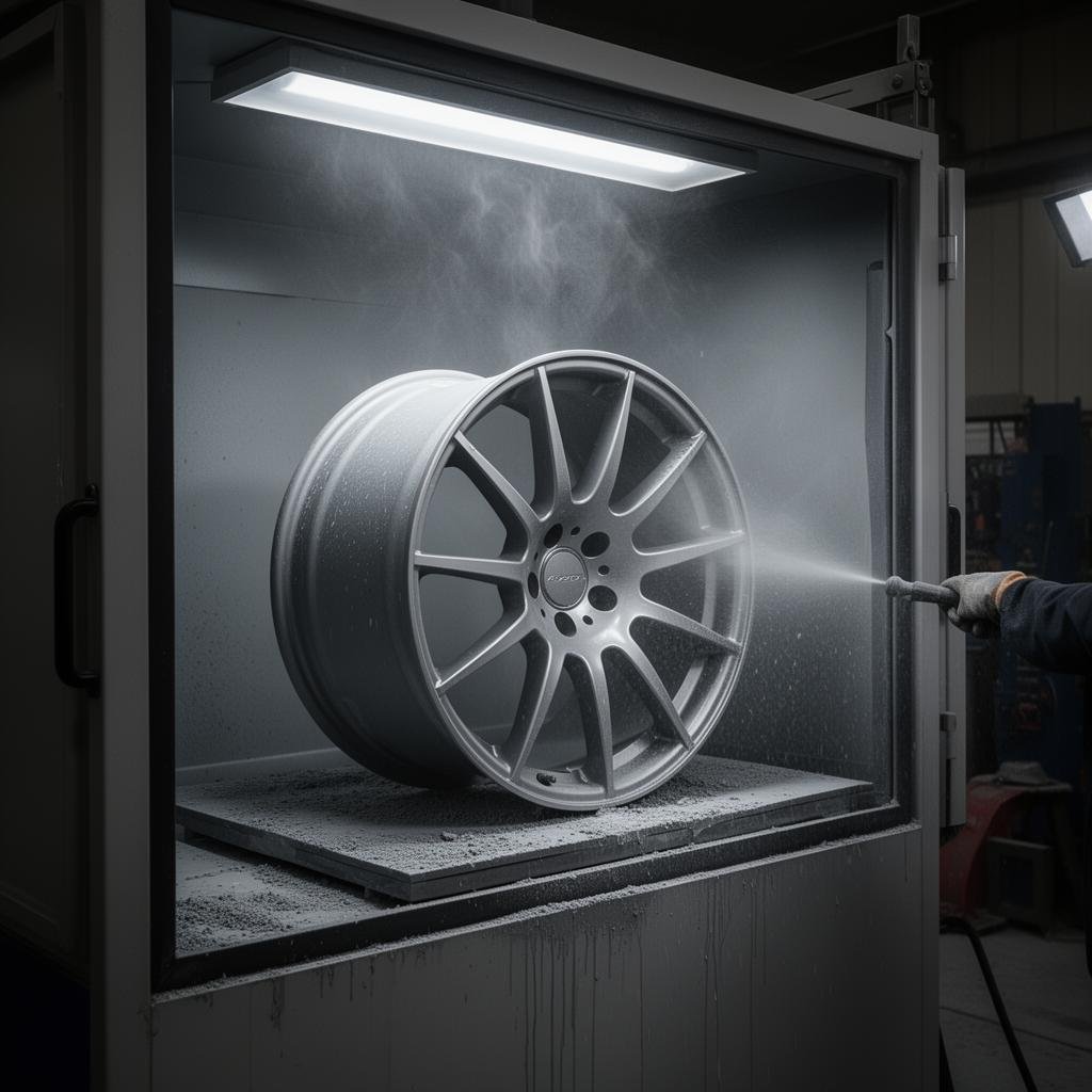 Vi sandblåser felgene for å fjerne rust, gammel lakk og skape perfekt grunnlag for ny finish.